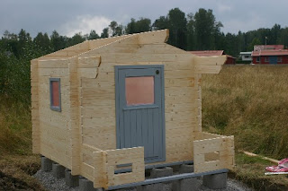 Tänään projekti Leikkimökki etenikin melkoisen harppauksen. Se ei vähimmässäkään määrin ole minun ansiotani, vietinhän päivän ensimmäiset tunnit naristen kuopan reunalla rakentamisen tylsyydestä... (ihan ensimmäisistä tunneista ei näin julkisella foorumilla puhuta *punastus*)